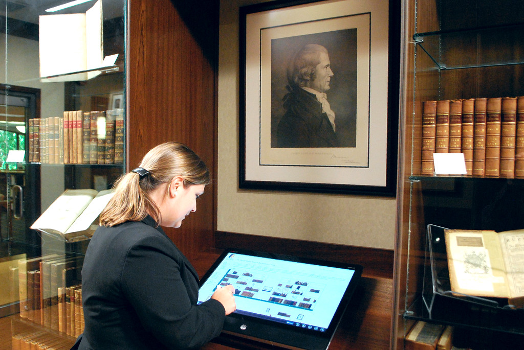 From the first printed edition of the first English law treatise, to presentation volumes inscribed by some of the greatest legal scholars of the twentieth century, the library's Special Collections cover every imaginable legal topic. Within the collection of nearly 2,900 volumes, particular treasures include two rare editions of the Digest of Justinian printed in Florence (1553) and Lyons (1566), an early 16th century version of Lyttleton’s Tenures in Englysshe, and multiple volumes previously owned by Virginia founding fathers. The Rare Book Room has on permanent display the family Bible of Chief Justice John Marshall, a circa 1825 portrait of Marshall, by John Wesley Jarvis, and the Law School mace, a replica of the royal mace in the British House of Commons. Rotating exhibits feature selections from the library's various rare book collections.